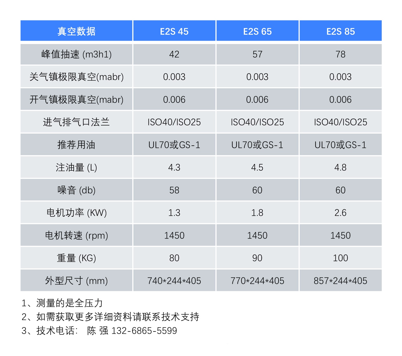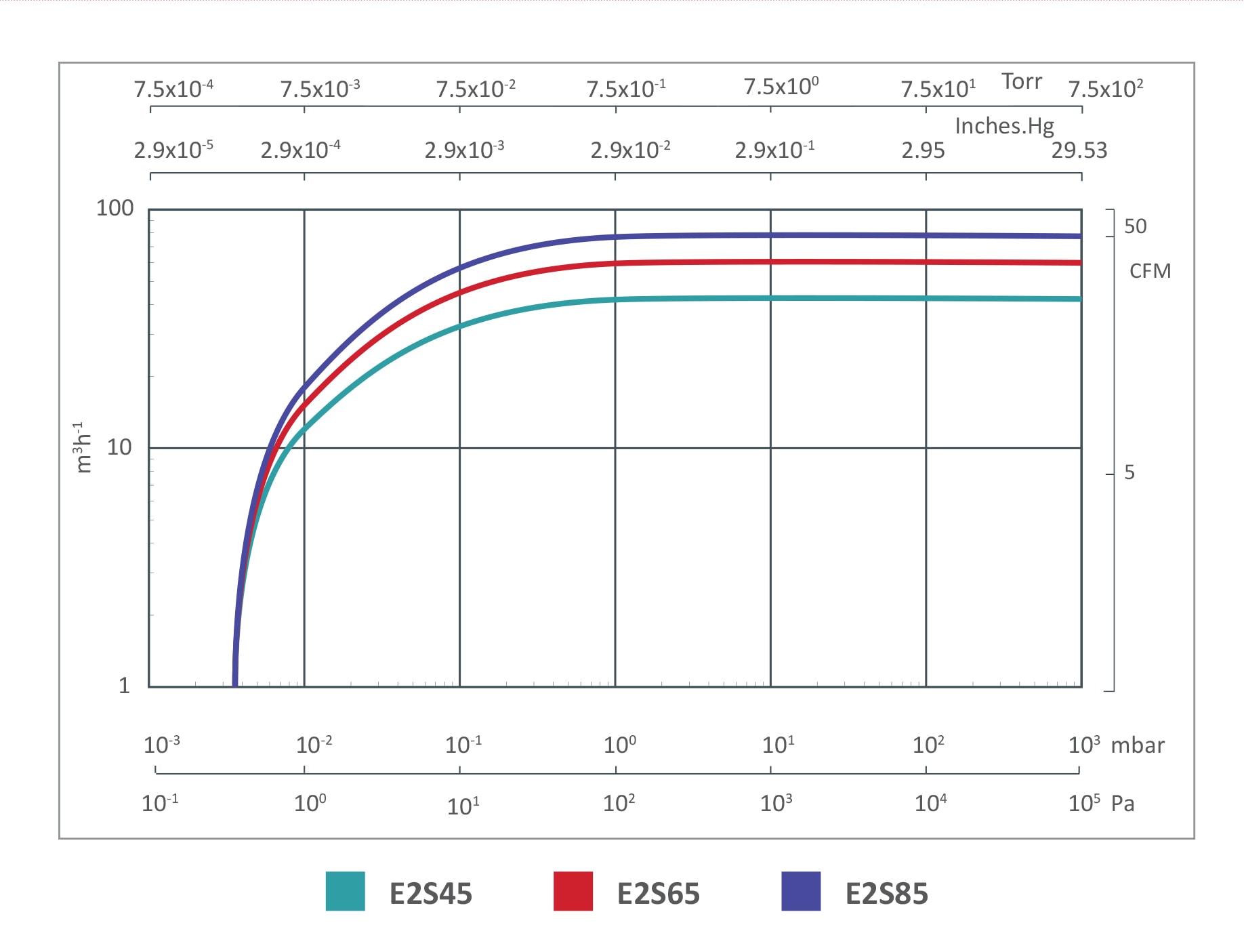 E2S 系列(E2S45、E2S65 和 E2S85)叶片泵使性能、成本和可用性达到理想平衡。设计可靠、结构简单,尤其适合需要中等真空的多种标准应用场所。它可以快速抽空,处理蒸汽,有助于更大限度地降低工作场所的噪声级。E2S 双级旋转式泵和 EH 机械增压器的标准组合可满足高容量需求。这些泵送系统在出厂前已预先装配,结构紧凑、移动方便且易于使用。E2S85-EH1200 可在大气压下直接启动,提供 900 m3/h (@60Hz) 的有效速度,并能够达到较高的真空范围,极限真空为 2×10-4 mbar。