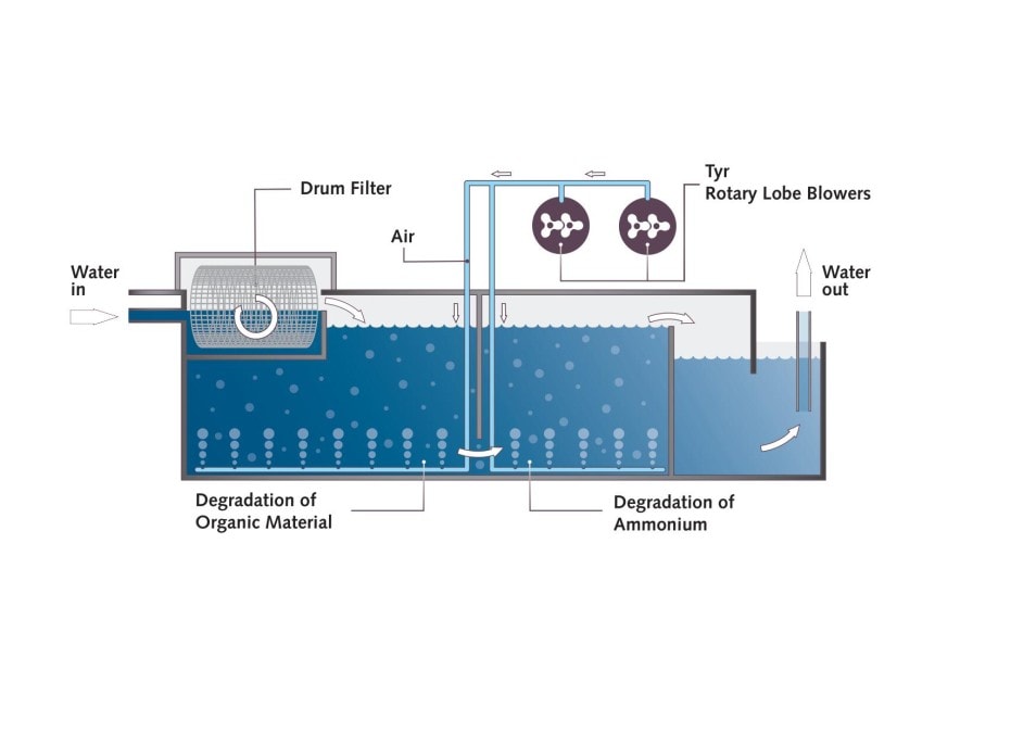 持久的氧气供应对于微生物的生长至关重要。RAS 设施使用了 Busch 普旭的 TYR 罗茨风机, 其中两台鼓风机(图 3)分别直接安装在两个细菌过滤器上。两台鼓风机交替运行,因此风机始终处于运行状态,这确保了向细菌过滤器中持续供应压缩空气,压缩空气则从底部进入水池。 除了提供富氧之外,压缩空气还能使水和浮标在水中上升时不断运动。